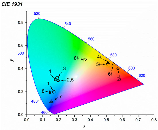 Color space chromaticity diagram of the studied samples coloration: (1) irradiated cancrinite, (2) kyanoxalite, (3) irradiated kyanoxalite, (4) afghanite from Sar-e Sang, (5) afghanite from Ladgvardara. Color coordinates of lazurite (7) [6] and slyudyankaite (8) [42] are shown for comparison. Chromaticity diagram of S2•− radical anion luminescence are given for: 2l—kyanoxalite; 4l—afghanite from Sar-e Sang; 5l—afghanite from Ladgvardara; 6l—nosean; 8l—slyudyankaite.