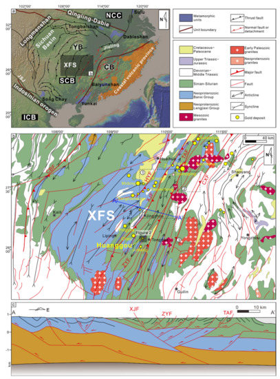 As the Jiangnan Orogen experienced several episodes of deformation, gold deposits in the orogen exhibit a complex mineralization age, ore-forming materials, and structural controls, resulting in great debates on ore deposit models. The XFSO exposes well-preserved structures associated with gold deposits and plays an excellent role in the understanding of deformation styles and tectonic patterns of the Jiangnan Orogen; however, the geometry and kinematics of the XFSO and how it controls the genesis and distribution of gold deposits are poorly understood [7,30,31] (Figure 1a,b). Furthermore, the widespread gold deposits in the Jiangnan Orogen have attracted great attention from geochemists and geochronologists for the past three decades [23,24,32,33,34,35,36]. In great contrast, the structural controls on gold deposits, especially in the XFSO, are seldom reported, which has greatly hindered the in-depth understanding of the mineralization of gold deposits [14,37,38]. Thus, a structural analysis on gold deposits in the XFSO is required to bring clarity to the mineralization of the orogen. This is the main motivation of this study.
