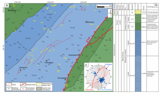 (a) Geological map of the Huanggou gold deposit. ZYF: Zhaiya Fault. (b) Stratigraphic chart of the Huanggou gold deposit. (c) Stereonet projection (equiangular; lower hemisphere) of our measurements shows the first-order NW-dipping Zhaiya Fault and higher-order SE-dipping faults. The orientations of beddings indicate the fold axis of the NE-striking regional Ergongling Fold plunges towards NE at a shallow angle.