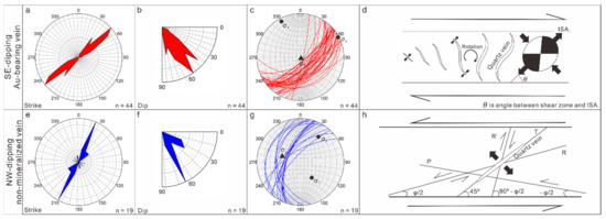 (a,b) Rose diagrams for Au-bearing quartz veins. (c) Stereonet projections (equiangular; lower hemisphere) for Au-bearing quartz veins and principal stress axes of D1. (d) Schematics showing progressive evolution of Au-bearing quartz veins in simple shear, strain is increasing to the right. (e,f) Rose diagrams for non-mineralized quartz veins. (g) Stereonet projections (equiangular; lower hemisphere) for non-mineralized quartz veins and principal stress axes of D2. (h) Schematics for non-mineralized quartz veins.