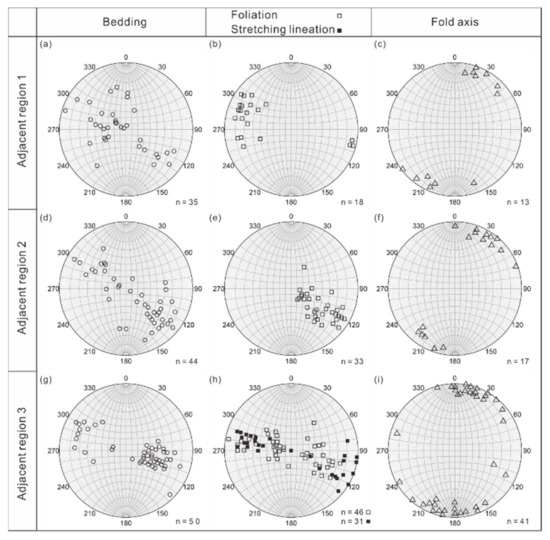 Stereonet projections (equiangular; lower hemisphere) for orientation data of bedding (a,d,g), foliations (b,e,h), stretching lineations (h), and fold axes (c,f,i) in adjacent regions of the Huanggou gold deposit. Orientation data are from [4,5] and the locations are shown in Figure 1b.
