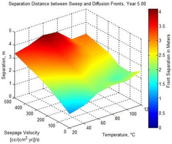 The separation distance between the low pH diffusion front and the high alkalinity sweep front as a function of seepage velocity, reservoir temperature, and time.