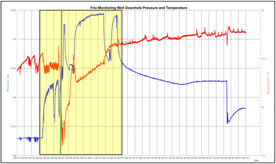 The observation well bottom hole pressure and temperature measurements during the month of October 2004. The injection period is represented by the yellow highlight. The breakthrough time is represented by the green vertical line.