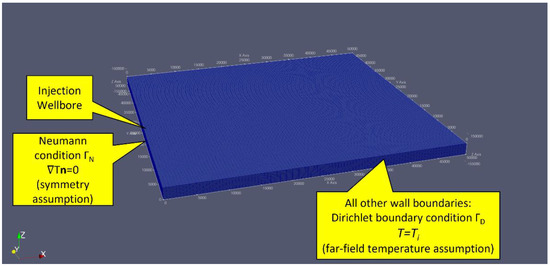 A mesh representing a 500 square-meter area of the Frio Formation. A Neumann boundary condition is imposed on the y-z plane at x = 0, such that the temperature gradient is 0 to implement a symmetry assumption on that wall. All other walls have a Dirichlet boundary condition of T = Ti imposed to implement a far-field constant reservoir temperature assumption. The simulated injection wellbore perforation interval was configured to −1527.5 m to −1533.75 m with respect to the z-axis at a y-axis location of 500 m. The injection fluid and reservoir initial temperature was configured to be Ti = 58.4 C. The injection mass flow rate was configured to be 3.0 kg/s.