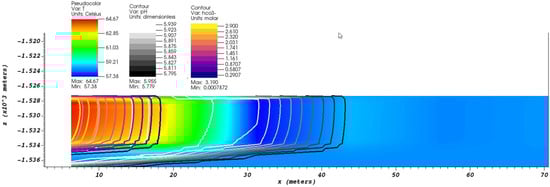 Figure 4 shows a contour plot of pH and [] on a slice along the perforation zone after 4 days of injection at a mass rate of 3 kg/s, with a background color mapped to temperature. The bicarbonate ion concentration front identifies the bulk effluent, indicated by thick purple to gold contour lines (a.k.a. “plasma colormap”). The initial reservoir water has a much lower bicarbonate concentration of 0.002 M. From the figure, one can see an acidic front develops ahead of the effluent indicated by black to white contour lines. A lower temperature fluid region develops in the lower pH (acidic) region, indicated by a darker blue background. In our simulation, we see the same pH drop before the arrival of a high concentration of bicarbonate ion 30 m from the injection zone.