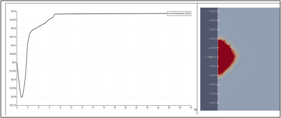 The Frio Formation physical domain is modeled as a 22-m-thick slab from z = −1517.00 m to z = −1539.00 m with a 500 m2 area. Figure 3 shows a plot in ParaView of the computational mesh. The y-z plane at x = 0 is the injection plane where a perforation zone from z = −1527.50 m to z = −1533.75 m models an injection well centered at y = 250 m. The injection wellbore diameter was configured to be 5.5 inches. A Neumann boundary condition is imposed on the y-z plane at x = 0, such that the temperature gradient is 0 to implement a symmetry assumption on that wall. All other walls have a Dirichlet boundary condition of T = Ti imposed to implement a far-field constant reservoir temperature assumption. The initial reservoir temperature was configured to be 58.4 °C, based on the observation well measurement data shown in Figure 2.