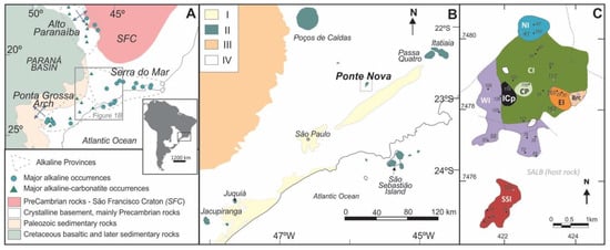(A) Geological setting of the alkaline intrusions of Cretaceous magmatism in the southeastern part of Brazilian Platform, with the distribution of major alkaline occurrences of Alto Paranaíba, Serra do Mar and Ponta Grossa Arch alkaline provinces (Modified after [45]). (B) Detail of A, with the location of the main occurrences. Legend: I. Sediments or sedimentary rocks associated with rift basins (Cenozoic); II: Alkaline complexes (Meso-Cenozoic); III: Sedimentary rocks of the Paraná Basin (Ordovician-Silurian); IV: Crystalline Basement, Brasília and Ribeira orogenic belts (Precambrian). Simplified from [45]. (C) Simplified geological map of the Ponte Nova alkaline mafic–ultramafic massif [41]. Utilized abbreviations: CI, central intrusion; WI, western intrusion; NI, northern intrusion; EI, eastern intrusion; CP, central plug; SSI, southern satellite intrusion; ICp, ilmenite clinopyroxenites and magnetitites; Brc, magmatic breccia; SALB: Serra de Água Limpa Batholith. Locations of studied samples are indicated as dots on the map; numbers in italic refer to samples analyzed by electron microprobe—wavelength dispersion system (EMP-WDS) and numbers in italic and underlined were analyzed by EMP-WDS and laser ablation—inductive coupled plasma mass spectrometry (LA ICP-MS).