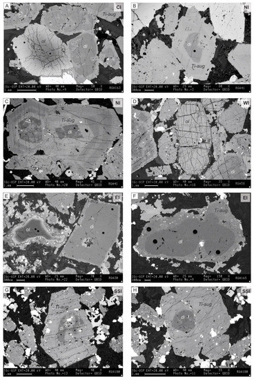 Coarse-grained clinopyroxene (diopside cores and Ti-augite mantling and rims) and olivine primocrysts are the main cumulus phases of the CI, WI and NI and the main macrocrysts of the EI and SSI from PN (Figure 2). Clinopyroxene, the main mafic phase of the entire PN massif, evidences complex growth histories. These are indicated by (i) completely to partially resorbed diopside cores, with dissolution surfaces (including gulf texture) and mantled (growth type) by Ti-augite, by (ii) completely to partially resorbed diopside cores, with pervasive resorption and replaced by intercumulus minerals (Ti-augite, biotite, kaersutite, magnetite, plagioclase), by (iii) normal step zoning, by (iv) crystals with oscillatory zoning with coarse banding and with reverse zonings included, and by (v) sieve-textured crystals (Figure 3; Table 1). All these types of zoning and textures are suggestive of open-system processes [9,29,31,55,56]. Olivine is found as cumulus crystals, as minor inclusions in few diopside cores, and partially involved by Ti-augite rims in the most primitive rocks of the CI, WI and NI (Figure 2 and Figure 3; Table 1). They present normal progressive zoning or occur as almost homogeneous crystals. In more evolved samples, olivine is absent or was completely resorbed. In EI, olivine is found as rounded macrocrysts presenting normal zoning and with resorption textures followed by pyroxene and biotite coronas. In SSI, olivine is also found as macrocrysts with normal progressive zoning and included in clinopyroxenite autoliths.