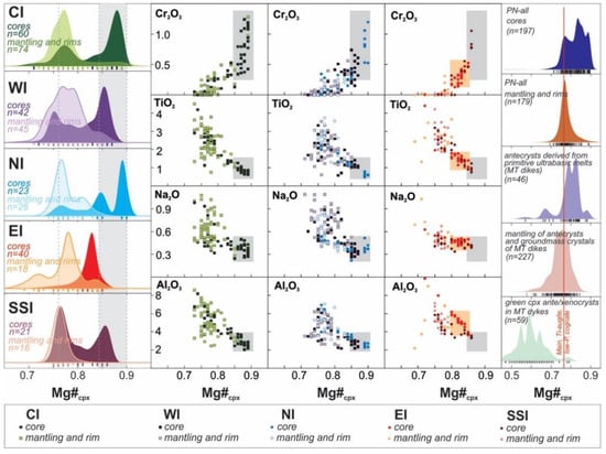 Clinopyroxene compositions of the Ponte Nova mafic–ultramafic alkaline massif. Kernel density estimates (KDEs; bandwidth = 0.01) of clinopyroxene Mg# distribution for each main intrusion of the massif indicate one peak of lower Mg# more compatible with Ti-augite compositions (gray dashed line) and one peak with higher Mg# compatible with diopside relict cores (gray bar). Interestingly, the KDE of Mg#cpx for PN antecrysts are very similar to that found for antecrysts from the nearby Mantiqueira Range lamprophyre and alkali basalt dikes, as well as the KDEs for PN mantling and rims are very similar to that found for Ti-augite mantling, rims and matrix crystals for the cited nearby dikes.
