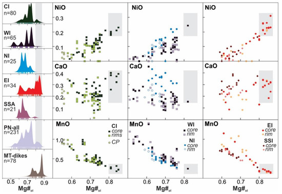 Olivine. Olivine crystals from the different intrusions of the PN are within the range of Fo86–Fo51, with crystal cores from EI and CI presenting the highest values (Fo > 80 mol.%) and crystals from CP and WI having the lowest ones (Fo < 56 mol.%, mainly rims) (Figure 6). Positive correlation is found between Fo and NiO (0–0.31 mass%) and negative correlation is found between Fo and MnO (0.14–1.14 mass%). CaO (0.01–0.67 mass%) does not present clear linear correlation with Fo although a tendency of higher CaO values for crystal cores with higher Fo is observed. Two olivine groups are identified: (i) one associated with almost unzoned, cumulatic olivine crystals, with Mg#ol [Mg/(Mg + FeT), molecular proportions] below 0.77, and (ii) another group is found for zoned olivine crystals with Mg#ol > 0.80 (gray bar in Figure 6).