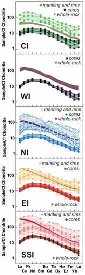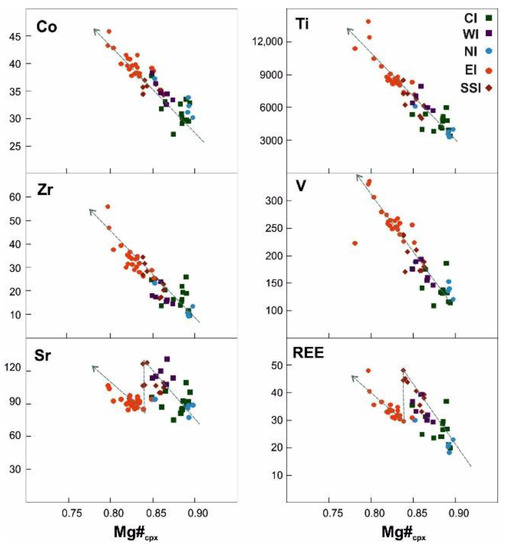 Regarding chondrite-normalized [57] rare-earth element (REE) distribution patterns of clinopyroxenes from the PN (Figure 7), relict cores of each intrusion present contrasting compositions; marked lower values in the relict cores when compared to those from mantling and rims (Figure 7; WI mantling and rims were not analyzed due to the extensive exsolution features presented in those crystals). All chondrite-normalized REE distribution patterns display smooth LREE/HREE fractionation and exhibit a concave downward pattern for normalized LREEs, with slightly depleted La values relative to Ce and Pr values, and a negative slope for normalized HREEs (GdN/YbN > 2.5). The compositions of some Ti-augite rims present an Eu-negative anomaly, suggesting a protracted crystallization of clinopyroxene, with its final stage just occurring after extensive fractionation of plagioclase. Whole-rock compositions (compiled from [41]—Supplementary Materials B) from the same units from which crystals were analyzed, present values of REE much more enriched than diopside cores (Figure 7). The relict cores found in the most primitive samples of each intrusion (all with resorption/corrosion features) present an evolution trend, the most primitive found for CI and NI (richer in Mg#cpx, Cr, Ni) and the most evolved related to EI (richer in Ti, Al, Na, Zn, Zr, REE, V, Co) (Figure 4 and Figure 7). This trend seems to be independent of that found for the mantling and rims of each intrusion, which present an important overlap for most element (Supplementary Materials E).