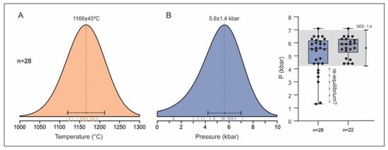 KDEs of temperatures and pressures calculated for the clinopyroxene antecrysts from PN using equations [66,68]. (A) Temperature KDEs is calculated with a bandwidth of 45 °C, as recommended in [66], with peak of estimations close to ~1180 °C. (B) Pressure KDEs is calculated with a bandwidth of 1.4 kbar, which is comparable to the SEE (1σ) of [68] barometer, with peak of estimations of pressure of ~5.6 kbar, accompanied by boxplot graph. Considering just the antecrysts with minimum re-equilibrium (n = 22), the peak of P is ~5.8 kbar, values also consistent with the medians obtained using boxplot graph.