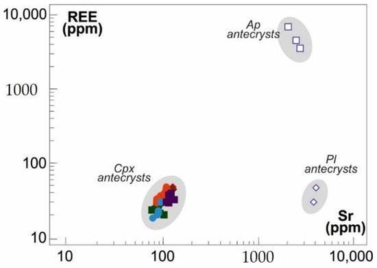 Diagrams of Sr (ppm) vs. REE (ppm) for PN clinopyroxene relict cores (antecrysts) compared with cumulatic plagioclase and apatite compositions in PN. Symbols of clinopyroxenes as in Figure 11.
