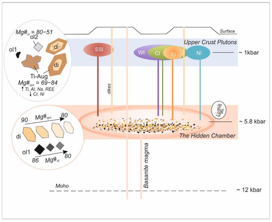 The petrological model of the PN massif [41] is assigned as repeated influxes of antecryst-laden basanite magmas. The primary cumulate intrusions of the massif deposit most of their suspended crystals on the floor of the upper-crust magma chamber. Each intrusion is representative of relatively primitive olivine- and clinopyroxene-phyric basanites that had assimilated different degrees of partial melts of heterogeneous host rocks [41,48]. The antecrysts presented in this work indicate that these influxes of antecryst-laden magmas could be derived from just one deeper magmatic chamber.