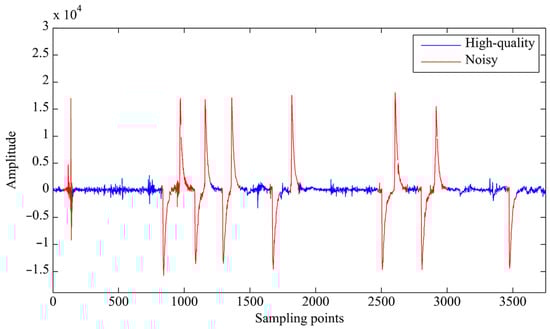We took an MSE less than or equal to 2.46 as the constraint condition of K-SVD sparse decomposition and then denoised the noisy signal automatically. We compared this signal with the original noise-free signal and the signal obtained by Wavelet threshold denoising (hereinafter referred to as Wavelet). As shown in Figure 8, both Wavelet and the method proposed in this paper could remove most of the artificially added noise. However, the Wavelet method obviously removed some low-frequency signals because the denoised signal became more stationary. It can be seen from Table 1 that the effect of our new method is obvious and all-round superior to the Wavelet threshold denoising. The signal-to-noise ratio (SNR) improved from −11.6127 dB to 8.2648 dB. The increase is more than 19.87 dB. The MSE decreased from 8.6797 to 0.8803, the normalized cross-correlation (NCC) [22] increased from 0.2366 to 0.9251, and the reconstruction error (RE) decreased from 3.8075 to 0.3862. The simulation results also show that our method is suitable for the suppression of different types of noise.
