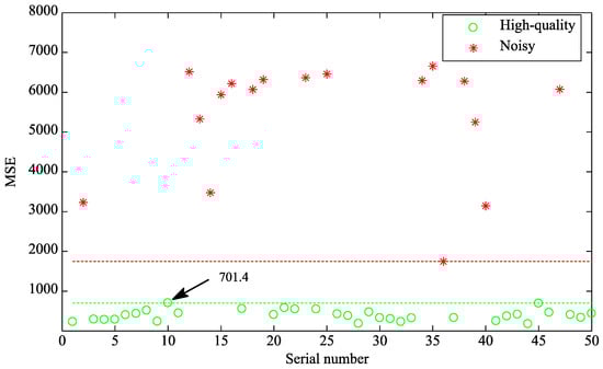 As shown in Figure 1, we divide a section of Ex component data with 3750 sampling points into 50 fragments. The dataset was collected in the Lujiang–Zongyang ore concentration area with a sampling rate of 150 Hz. Each fragment is a sample with a length of 75 sampling points. Then, each fragment was carefully screened and marked as a high-quality fragment or noisy fragment. Finally, the MSE of each fragment was calculated, and the MSE scatter diagram is drawn in chronological order (see Figure 2). It is clear that the MSE values of high-quality fragments at different time locations are very close, indicating that the scheme of using high-quality fragments to estimate the MSE of noisy fragments is feasible. To avoid the loss of effective signals as much as possible, we took the maximum MSE value in the high-quality fragments as the MSE of the noisy fragments in the same data set. In this example, the maximum MSE value of the high-quality fragments is the tenth sample, and its MSE is 701.4. Therefore, when sparse decomposition is performed for noisy fragments, the stop condition of iteration is that MSE is equal to 701.4. As the number of iterations increases, the noise removed gradually increases, and the MSE of the residual signal gradually decreases. When the MSE of the residual signal is less than or equal to 701.4 after an iteration, the iteration is stopped, and the residual signal at this time is the denoised signal. In this way, most of the large-amplitude cultural noises can be removed, and the loss of effective signal can be avoided as much as possible.