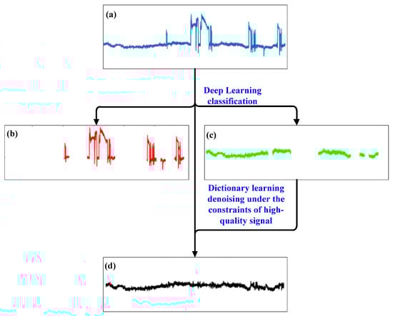 The steps of the proposed method. (a) Raw signal. (b) Noisy signal. (c) High-quality signal. (d) Reconstructed signal.