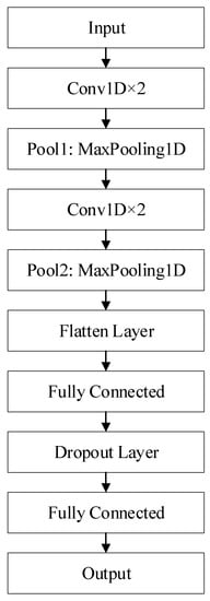 The CNN network constructed in this paper includes an input layer, four convolution layers, two pooling layers, a flattening layer, two fully connected layers, a random dropout layer, and an output layer. The specific construction is shown in Figure 4. The first layer is the input layer where the data enter the neural network after preprocessing. The second, third, fifth, and sixth layers are one-dimensional convolutional layers (Conv1D). The essence of convolution is to convolve a binary function into a unary function. The convolution operation can filter out the useless signal or noise while strengthening the useful feature information. Multi-layer convolution is used to continuously learn the data features of the upper layer input. After multi-layer convolution processing, complex features of the data can be fully learned. The fourth and seventh layers are the one-dimensional maximum pooling layer (MaxPooling1D), also known as the down-sampling layer, which can reduce the dimensions of the data information. The dimensionality becomes higher after convolution. Therefore, a pooling layer is established to achieve the same amount of data feature information and reduce the dimensionality, redundancy, and complexity of subsequent calculations. The data output by the previous convolutional layer are filtered, and features are extracted by max pooling. The remaining eigenvalue signal model will be simpler than the original signal model because the unwanted signals are filtered out, which can improve the robustness of the extracted features. The eighth layer is the flattening layer, which converts the multi-dimensional data into one-dimensional data and then transfers the one-dimensional data to the fully connected layer. The ninth and eleventh layers are fully connected layers, which are mainly responsible for merging and sorting out the feature information extraction after pooling and saving useful information. The disadvantage is that some location information may be lost. The tenth layer is a random dropout layer. When connected in this way, some neurons can be suspended and no longer participate in training. On the one hand, it can simplify the neural network, and on the other hand, it reduces the dependence between neurons to prevent overfitting. Finally, the data are sent to the fully connected layer. The twelfth layer is the output layer, which outputs the processed data in the fully connected layer.