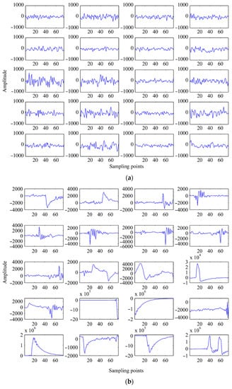 Samples are datasets for model training. Good training results mainly depend not on how good the model is, but more on the quantity and quality of the samples used for training. Zhang et al. [29] found that the recognition accuracy of MT data is positively correlated with the length of samples, but the training time will rise significantly with the increase in the sample length. The study also shows that when the sample length is 64 sampling points, very high classification accuracy can be obtained with high efficiency. The acquisition of MT data is sometimes discontinuous. Therefore, we set the sample length to 75 sampling points, a value close to 64, in order to not destroy the timing information of the original signal and to obtain high classification accuracy and efficiency. The observation duration of one sample is 0.5 s at a sampling rate of 150 Hz. Figure 5 shows some typical samples in the training set. It is found that the high-quality sample has a slow change in signal amplitude over time and a small average amplitude. Noisy samples often have shock-like structures with strong instantaneous energy. The average amplitude is significantly larger than the high-quality signal. Its magnitude is sometimes even several orders larger than the high-quality signals. It is well known that high-quality and noise-sample libraries have obvious differences, which are easily manually labeled or learned by the machine.