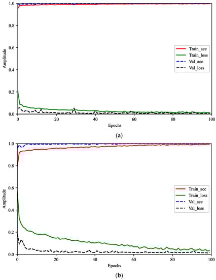 The resulting sample library data were imported into the model for training. We adjusted the model or the sample library according to the training results. The training results of the electric channel data are shown in Figure 6a, including a training accuracy of 99.4%, a training loss of 0.016, and validation accuracy of 99.8%, and a validation loss of 0.015. The training results for the magnetic channel data are shown in Figure 6b. The training accuracy was 99.72%, and the training loss was 0.019. The validation set accuracy was 99.4%, and the validation loss was 0.014.