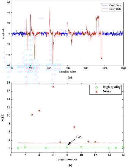 (a) Identification results of the simulated signal. The red line indicates noisy clips, and the blue line indicates high-quality clips. (b) The MSE distribution of the simulation signals. The red stars represent noisy samples, and the green circles represent high-quality samples.
