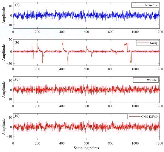 Denoising effect of the simulated signal. (a) Noise-free signal. (b) Noisy signal. (c) Signal denoised by the Wavelet threshold method. (d) Signal denoised by the CNN-KSVD method.