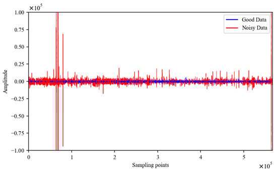 Recognition results of the Ex component of the real site BL14173A. The red line indicates noisy data, and the blue line indicates high-quality data.