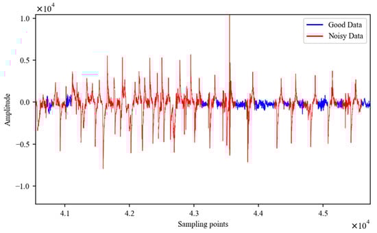 To verify the effectiveness of the proposed method in actual magnetotelluric data processing, we applied the proposed method to the time-series with strong interference collected in the ore-concentration areas of Lujiang–Zongyang. Figure 9 shows the recognition results of the Ex component of the real site BL14173A. It can be seen that the dataset was polluted by very strong and persistent cultural noise. In addition, a few spikes were marked in blue, which are noisy segments not accurately identified by the model. Since there are few instances of unrecognized noise and they are small in amplitude, the noise has little impact on the results. Figure 10 presents a partial segment of the results shown in Figure 9. Obviously, all large-amplitude cultural noises have been accurately identified. Compared with the results of manual marking, it was found that the recognition accuracy was as high as 95.66%.