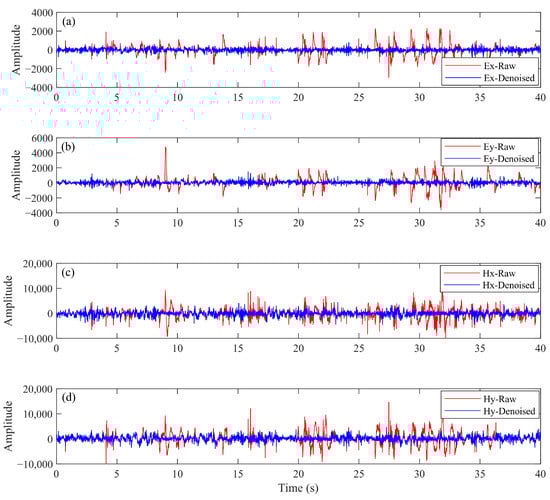 Denoising results of real MT data collected in the station of BL14182A. (a–d) represent the Ex, Ey, Hx, and Hy components, respectively. The red line represents the raw data and the blue line represents the high-quality data obtained by our new method.
