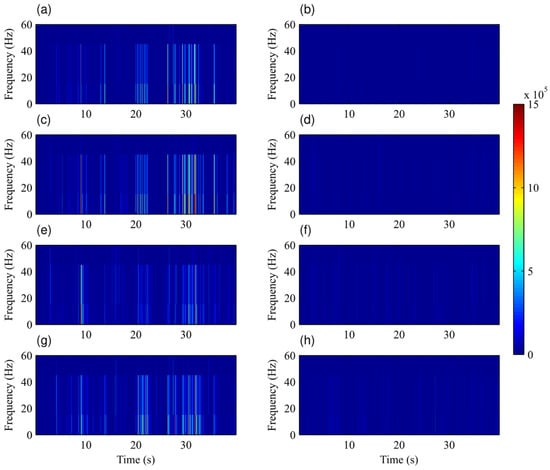 Similarly, we analyzed the time-frequency spectrum of the denoised results. As shown in Figure 14, the noise of the original signal was mainly concentrated in the part below 40 Hz, and it can be seen that the effect of this noise on the resistivity and phase curve was also mainly concentrated in the part below 40 Hz. The time-frequency spectrum energy of the extracted noise signal is concentrated in the noisy period, and the energy is weak in the rest of the time period. After denoising, there is no period of abnormal-large energy in the signal, which shows that the proposed method accurately eliminates the noise.