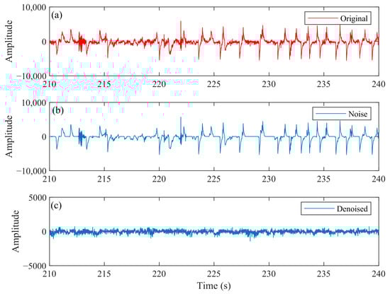 The denoising effect of a segment in the Ex component of the station BL14173. (a) Original signal. (b) Extracted noise. (c) Denoised signal.