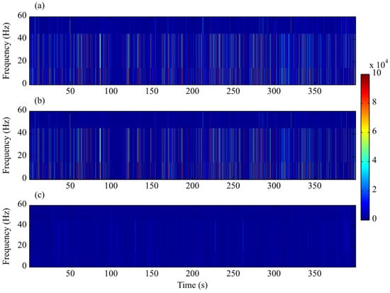 The time-frequency spectrum of the signals shown in Figure 13. (a) Raw time-frequency spectrum. (b) Time-frequency spectrum of the extracted noise. (c) Denoised time-frequency spectrum.