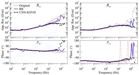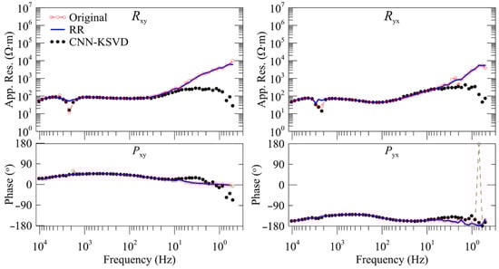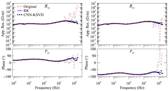 The apparent resistivity and phase curves of the real site BL14182A. Rxy and Ryx in the upper panels represent the apparent resistivity in XY direction and the YX direction, respectively; Pxy and Pyx in the bottom panels represent the phase in the XY direction and the YX direction, respectively; the red hollow circle represents the curves calculated from the original noisy data (Original), the blue solid line represents the curves treated by the remote reference processing (RR), and the black solid circle represents the curves calculated using the data denoised by our method.