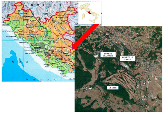 The area of this study is the Anticolana Valley, situated in the Lazio region of central Italy (Figure 1), where the municipality of Fiuggi is the most important town. According to the Lazio soil map, these are intermountain basins with areas of accumulation on predominantly reworked volcanic deposits and slopes with inconsistent pyroclastic deposits. Soils in this area are classified as Eutric Cambisols (>75%) and Calcaric Endoskeletic Cambic Phaeozems (<10%) [6].