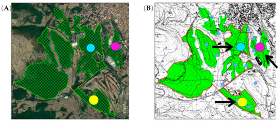 Three homogeneous plots (150 m × 150 m) were chosen to represent these areas. The sampled woodland areas are located above the sources of Fiuggi’s oligomineral waters, as shown in Figure 2.