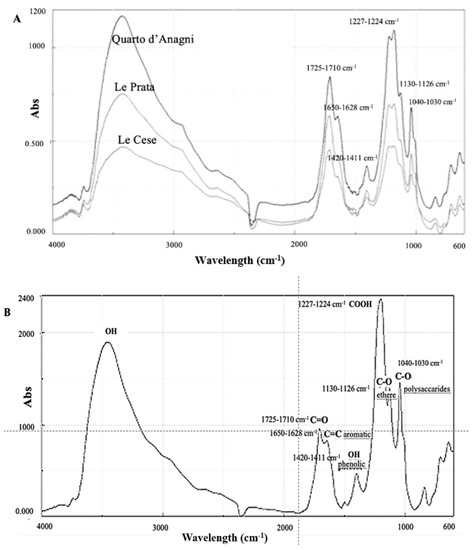 The absorbance distributions obtained from the FAs did not show significant differences from the literature data [14], with an intense band at 1720 cm−1 due to the presence of a high amount of carboxyl groups. Peaks at 1720–1630–1120 cm−1 were clearly visible in FAs extracted from both soil and mineral water. A very intense band was present in the range of 1227–1224 cm−1 (C-O elongation and O-H deformation of COOH groups), indicating the presence of an important acid component in the FA structure. The spectral absorbances acquired for FA showed no significant differences from those reported in the literature [14], with an intense band at 1720 cm−1 due to the presence of a high amount of carboxyl groups. No main differences were found between the samples.