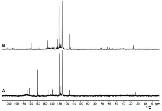 1H and 13C NMR spectra were recorded on Bruker AVANCE III HD 400 spectrometers equipped with a 5 mm smart probe. TMS (tetramethylsilane) was used as an external reference. Sample preparation as well as the acquisition and processing of NMR spectra were performed as previously described [38]. Specifically, 1H NMR spectra were recorded using the standard pulse sequence available on Bruker for selective saturation of the HDO resonance. The pre-irradiation time was set to 10 s, the spectral width was set to 18 ppm (7212 Hz), the FIDs were acquired using 32 K data points, the acquisition time was 2.3 s, a 45° flip pulse angle was used, and 64 scans were averaged for a total acquisition time of 15 min. A line broadening of 0.1 Hz and zero-filling to 64 K digital points were applied prior to Fourier transformation. 13C{1H} NMR spectra were recorded using the inverse-gated decoupling scheme to avoid nuclear Overhauser enhancement (NOE). The pre-scan delay was set to 2 s, the spectral with was set to 282 ppm (28,410 Hz), the FIDs were acquired using 128 K data points, the acquisition time was 2.3 s, a 45° flip pulse angle was used, and 10 K scans were averaged for a total acquisition time of about 12 h. 1H NMR spectral integration was performed by dividing the spectrum into six regions [38]: 0–1.7 ppm for CH, CH2, and CH3 moieties, at least two carbon atoms away from polar functional groups or aromatic rings; 1.7–3.0 ppm for CH, CH2, and CH3 moieties in the a position with respect to carboxylic acids or aromatics; 3.0–5.0 ppm for CH, CH2, and CH3 moieties in the a position with respect to oxygen groups (polysaccharides or carbohydrates); 5.0–6.5 ppm for olefinic protons; 6.5–9.0 ppm for aromatic protons; and 9.0–12.0 ppm for protons of aldehydes. 13C NMR spectral integration was performed by dividing the spectrum into five regions [38]: 0–50 ppm for aliphatic carbons, 50–110 ppm for carbon atoms directly bonded to oxygen, 110–165 for aromatic carbons, 165–190 ppm for carboxylic carbons, and 190–210 ppm for carbonylic carbons.