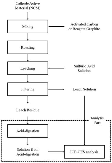 Before the leaching tests, a 1 mol/L H2SO4 solution was prepared with sulfuric acid (95%, Junsei Chemical Co., Ltd., Tokyo, Japan). The leaching tests of the cathode samples before and after roasting were performed in a 500 mL, four-necked Pyrex glass reactor using a heating mantle to maintain the temperature. The reactor was fitted with a reflux condenser and an agitator. The reflux condenser was inserted into one port to avoid solution loss at high temperatures. In a typical run, 200 mL of 1 mol/L sulfuric acid solution was poured into the reactor with an agitation speed of 400 rpm. After the temperature of solution reached the thermal equilibrium at 90 °C, 5 g of the roasted sample was added to the reactor in all the experiments. During the leaching tests, 3 mL of the solution was withdrawn periodically at a desired time interval (5–120 min) by a syringe. The sample was filtered using a 0.45 µm membrane filter, and the obtained filtrate was diluted with 5% HNO3 solution. The leach residue was digested with aqua regia, and the solution was diluted with distilled water. All experimental procedures are summarized in Figure 1.