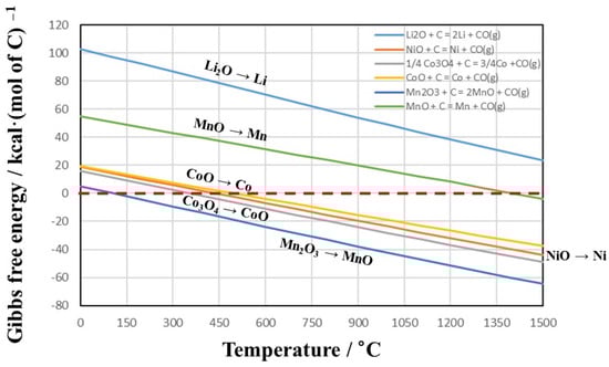 The NCM cathode active materials are found to be oxides, although the oxidation state of metals is higher than +3 [10,11], and the crystal structure of cathode is transformed from a hexagonal crystal system to a monoclinic crystal system during repeated charging and discharging. However, there has been little information about the Gibbs free energy of active materials. Therefore, the carbothermic reduction processes of metal oxides such as Li2O, MnO, Mn2O3, NiO, CoO, and Co3O4 were expressed to predict the reduction process, as a route represented in Figure 2, which was created using the software of Outokumpu HSC Chemistry 5.11. As shown in Figure 2, the Gibbs free energies decreased with increasing temperature; 1350 °C or higher is required to reduce Li2O or MnO to Li or Mn metal, whereas CoO or NiO can be reduced to Co or Ni metal at 600 °C or lower.