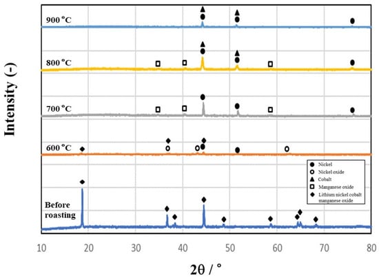 Figure 5 shows the leaching behaviors of Li, Ni, Co, and Mn from the samples roasted at 600 °C–900 °C in a 1 mol/L sulfuric acid solution at 90 °C and at 400 rpm with 2.5% pulp density (5g/200 mL). The leaching efficiencies increased rapidly within 15 min, and all leaching efficiencies reached over 99% at 60 min. In the cases of Li and Mn, the leaching efficiency increased from 73.6% and 76.7% at 600 °C to 99.2% and 97.2% at 800 °C, respectively, at 10 min of leaching time. Figure 6 shows the leaching efficiencies of Ni and Co at 10 min of leaching time with the roasted temperatures. The leaching efficiencies of Ni and Co decreased from 94.8% and 96.4% in the sample roasted at 600 °C, to 88.1% and 86.8% at 900 °C, respectively. At the beginning of leaching at approximately 10 min, the leaching efficiencies of Ni and Co decreased with increasing roasting temperature, but all leaching efficiencies increased over 99% within 60 min.