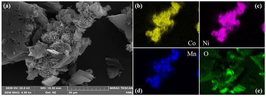 SEM images of (a) sample roasted at 700 °C and EDS results of (b) Co, (c) Ni, (d) Mn, and (e) O.