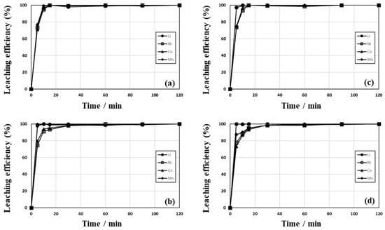 The leaching behaviors of Li, Ni, Co, and Mn from samples roasted at 600 °C (a), 700 °C (b), 800 °C (c), and 900 °C (d).