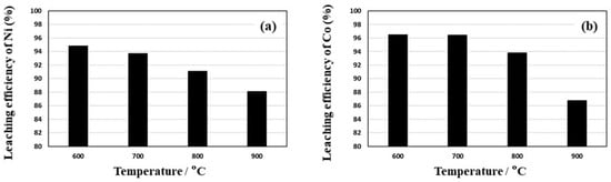 Leaching efficiencies of Ni (a) and Co (b) from samples roasted at 600 °C–900 °C.