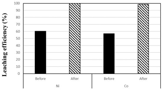 The leaching efficiencies of Ni and Co from samples before and after roasting.