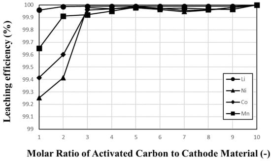 The effects of carbothermic reduction roasting with activated carbon on the leaching of Ni and Co are shown in Figure 7. The NCM622 sample was roasted at 700 °C with a 1:10 molar ratio for 1 h, and then, the roasted product was leached in a 1 mol/L H2SO4 solution at 90 °C and at 400 rpm with 2.5% pulp density for 2 h. In the case of NCM622 leaching without roasting, the leaching efficiencies of Ni and Co were 60.5% and 56.8%, respectively, while the leaching efficiencies increased over 99% by roasting NCM622 with activated carbon. These results suggest that roasting with carbon sources enhances the leaching of cathode active materials. In the same leaching tests, the leaching efficiencies of Li and Mn increased over 99% within 2 h regardless of roasting. Figure 8 shows the effects of various mixing ratios of NCM622 and activated carbon on the leaching efficiencies of Ni, Co, Mn, and Li. Under most ratios, although the leaching efficiencies indicate rates above 99% regardless of the ratio, the leaching efficiencies of Ni and Co were slightly lower at the ratios of 1 and 2.