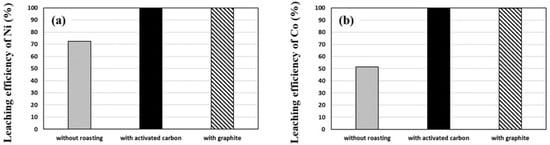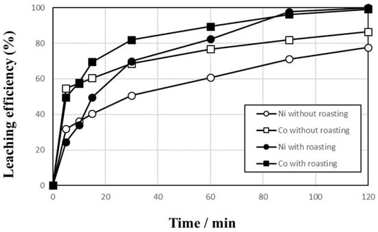 Generally, in recycling processes of LIB, pretreatments such as dismantling, crushing, and screening have been performed before leaching processes, and the product obtained from the pretreatment processes contains active cathode and anode materials, which is called black powder. Figure 11 indicates the leaching behaviors of Ni and Co from the black powder with and without roasting, which was performed at 700 °C with a 1:4 molar ratio for 1 h. The reagent-grade graphite was added to the black powder to reach the molar ratio. The leaching test was conducted in a 1 mol/L sulfuric acid solution at 90 °C and at 400 rpm with 2.5% pulp density. The leaching efficiencies increased rapidly within 30 min, and then gradually. When the black powder was roasted, the leaching efficiencies increased to over 99.9% while the leaching efficiencies of Ni and Co increased to 77.6% and 86.5%, respectively, using the black powder without roasting.