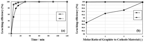 Currently, in Korea, there are very few end-of-life electric vehicles, and recycling companies in Korea have treated lithium-ion batteries generated from manufacturing processes. Therefore, leaching tests were performed with scrapped active cathode material obtained from manufacturing processes, and the samples were roasted at 700 °C with a 1:10 molar ratio for 1 h followed by leaching in a 1 mol/L sulfuric acid solution at 90 °C and at 400 rpm with 2.5% pulp density. The leaching behaviors of Ni and Co are shown in Figure 10, where the leaching results of Li and Mn are not shown because the leaching efficiencies increased rapidly over 99.9% within 10 min. Although the leaching efficiency of Ni increased more slowly than that of Co, the leaching efficiencies increased over 99.9% within 30 min, as shown in Figure 10a. The effects of the molar ratio of the graphite-to-cathode material were also investigated using the scrapped active cathode material, and, as shown in Figure 10b, the leaching efficiency of Ni increased by increasing the molar ratio even though the efficiency was over 99.6% when the ratio was 1:1, whereas the leaching efficiency of Co remained over 99.9%.