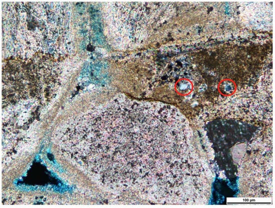 Field of view: 0.62 mm, cross-polarized limestone sample. Very-fine grained quartz is included in inclusion-rich fragments. Holes are highlighted by the blue epoxy used in thin section preparation. Red circles reveal smaller grains closer to the respirable size range.