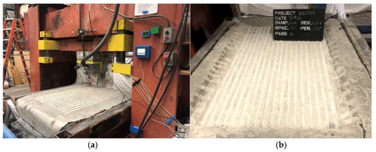 Images of (a) LCM with the limestone block installed and dust curtain around the pick; (b) The surface of the limestone block surrounded by concrete after the completion of a pass at 1.5-inch spacing across the surface.