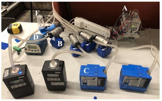 (A) Data acquisition interface and power unit that controls when dust is collected and flushed out of the system; (B) Electric ball valves to control the on and off of air flow through the cyclones and TDS; (C) Pumps running at 1.7 or 1.0 L per minute; (D) Real-time dust concentration monitor, (E) Rotameter currently placed in-line before testing to ensure pumps are running at appropriate flow rate.
